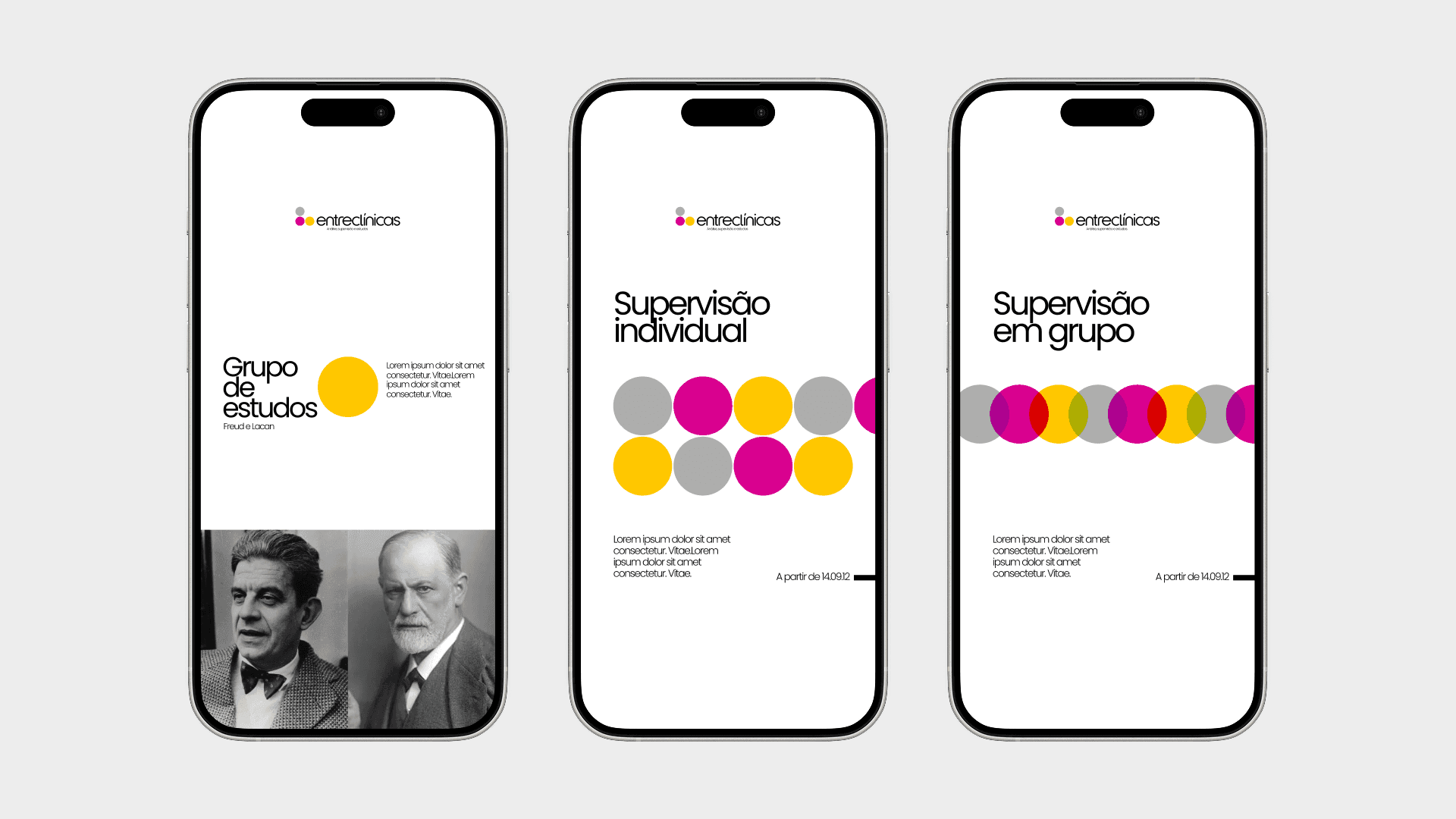 Our process began with an in-depth exploration of the psychoanalysis field and the partners vision. We interviewed the psychoanalysts to understand their references, values, and the exchange dynamics they wanted to create. We also analyzed similar spaces and how psychoanalysis visually communicates itself, ensuring that the branding would respect its essence while bringing freshness and authenticity. The name Entreclínicas originates from the value found in the exchanges between psychoanalysts in the time between sessions.